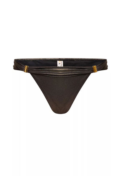 Maia’s bikini briefs sit beautifully low on the hips thanks to their gathered waistband, while the subtle ruching detail on the back enhances your curves. The supremely beautiful glittering gold dust fabric is finished with our statement gold NAIA trims.
