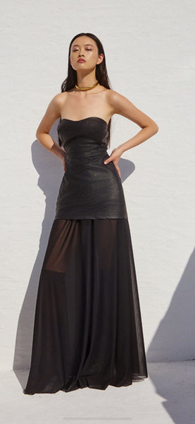 Mini eco leather strapless dress with removable mesh maxi skirt. An occasion dress that stands out, ideal for those seeking a sophisticated yet daring look. Made from a midweight stretch fabric with scuba cupro touch that offers elasticity and flexibility.