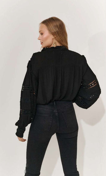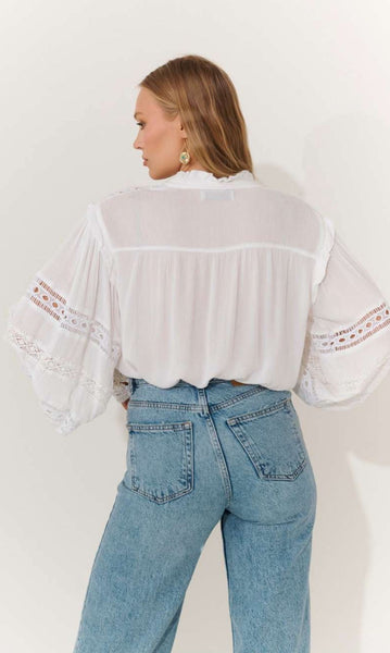 White blouse with a round neckline and long puffed sleeves finished with buttoned cuffs. Matching perforated embroidery detail and ruffles. Front button closure.