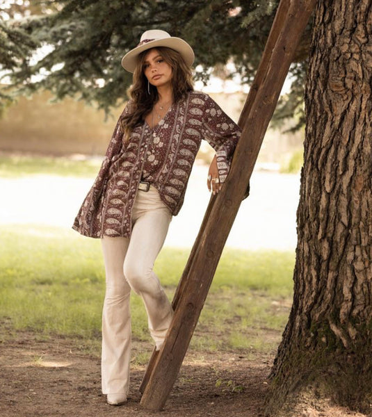 Looking for pretty and comfortable pants? Do not look any further, we got u covered! The Dawn Flared Pants is made of a soft jersey with a peach handfeel. It has an allover print and the flare starts from below the knee. Combine the Dawn Flared pants with our Zina wrap top.