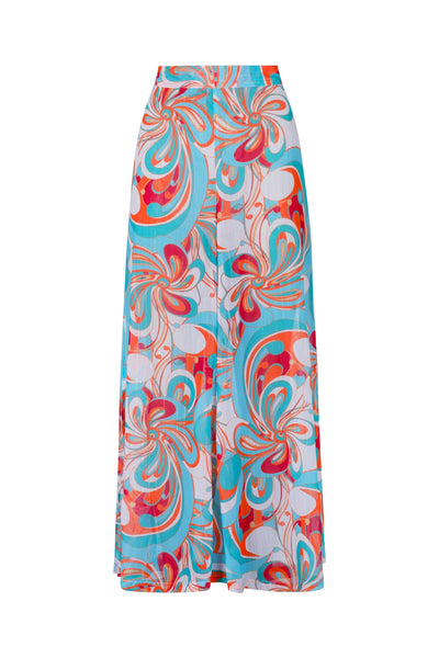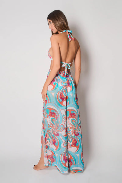 Add instant wow to any swimwear by slipping on the South Beach Side Split Trousers. Watch as they catch delicately on a sea breeze and flutter in the warm air. A beautiful fine gold lurex thread captures the light and adds a touch of glamour to the light chiffon fabric. Pair them with a block colour or matching print.