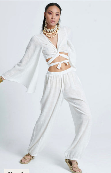 Wide leg cotton gauze trousers featuring an elastic waist and elastic leg hem.