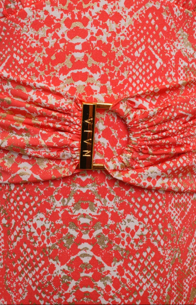 She was such a hit in gorgeous gold that we’ve given her a sun-kissed new look in our captivating coral. Complimenting a plethora of skin tones, her sumptuous snake print features flecks of gold foil that dazzle under the shimmering sun. Every little detail has been thought of in her creation from the flattering halter neckline that allows you to determine your preferred fit, to the gentle gathering at the bust and waist, creating a subtly sexy silhouette. A delicately gathered panel frames the small of your back, while NAIA signature trims add a luxurious design detail. In the words of the fabulous Goldie Hawn – “Live in the moment, especially if it has a good beat” – we think the Goldie swimsuit encapsulates this feeling perfectly.
