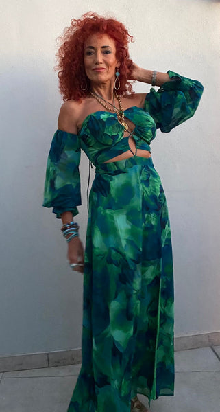 Our Karma Maxi Dress features a halter neck style, cut outs under the bust, side split, off the shoulder elastic sleeves, and an invisible centre back zipper. This garment has lining and no stretch. 100% Polyester. Please refer to care label for garment care instructions. Colours may appear slightly different to the website due to lighting, computer picture resolution and monitor settings. Print placement may vary between each individual item