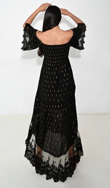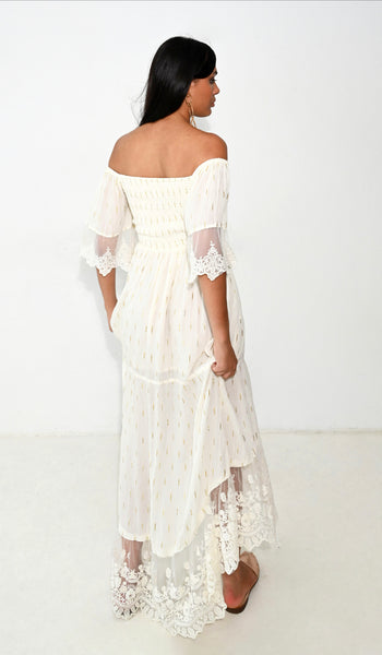 Long off shoulder dress with lace sleeves adorned with gold thread