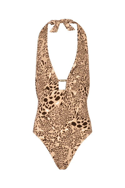 A piece that attracts all the right attention, the Miami Plunge Swimsuit really is one to be adored. In an exotic Golden Leopard Print, complimented by subtle gold flecks, she comes alive when sparkling in the sun. A plunging neckline, gathered waist, low V back with ruching, and the high leg just scream glamour, while the halter neck tie works to compliment your figure.