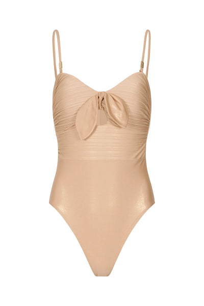 As breathtaking as the beauty of Tuscany, this is an enchanting design that encapsulates La Dolce Vita perfectly. Crafted in the most luxurious of gold fabric which shimmers beautifully in the sun, the elegant plisse detailing to the top, combined with our Trademark Subtle Sculpt power mesh all works together to provide the sleekest of silhouettes. An adjustable front tie and detachable straps allow you to create a style that’s bespoke to you, while the gold detailing adds that touch of luxury we know you love.